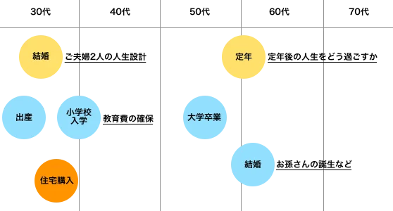 夢のある将来、安心できる生活を誰もが願うものです。そういった生活も ライフサイクルによって生活設計すれば、より安心できる豊かな人生が約束されます。 お子様の誕生、教育、住宅、定年後の生活・・・人生の中でさまざまな出来事がある中で 生活設計を立てて、収支のバランスがどのようなときに崩れるかを予想し、 そのために必要な費用を準備しておく必要があります。